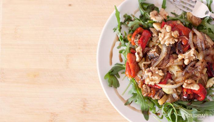5. Monta la ensalada: primero pon un poco de rúcula, verduras asadas, cebolla caramelizada y nueces. Por último, aliña a tu gusto.