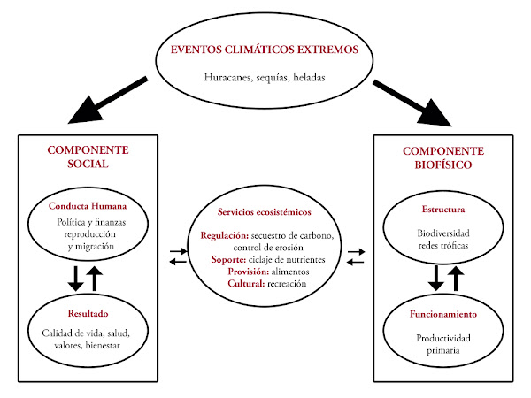 Figura 2. Diagrama conceptual simplificado de cómo interactúan los eventos climáticos extremos con los socio-ecosistemas. Los servicios ecosistémicos conectan a la sociedad con su entorno biofísico (Modificado de Collins et al. 2011).