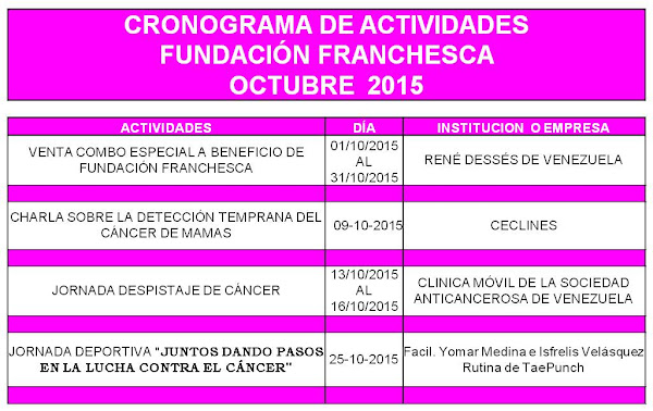 Aquí les dejo su cronograma de actividades a realizar en Guarenas, para quienes quieran y puedan participar, les recuerdo que el 19 de Octubre es el día Internacional del cáncer de mama y por ende mes de recaudar fondos.