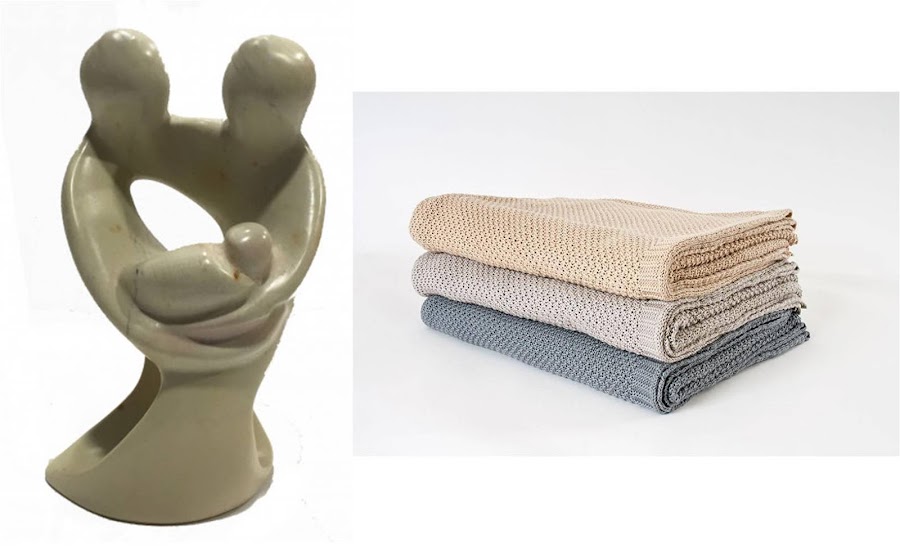 Estatua de abrazo familiar.Plaids en colores neutros de algodón orgánico.