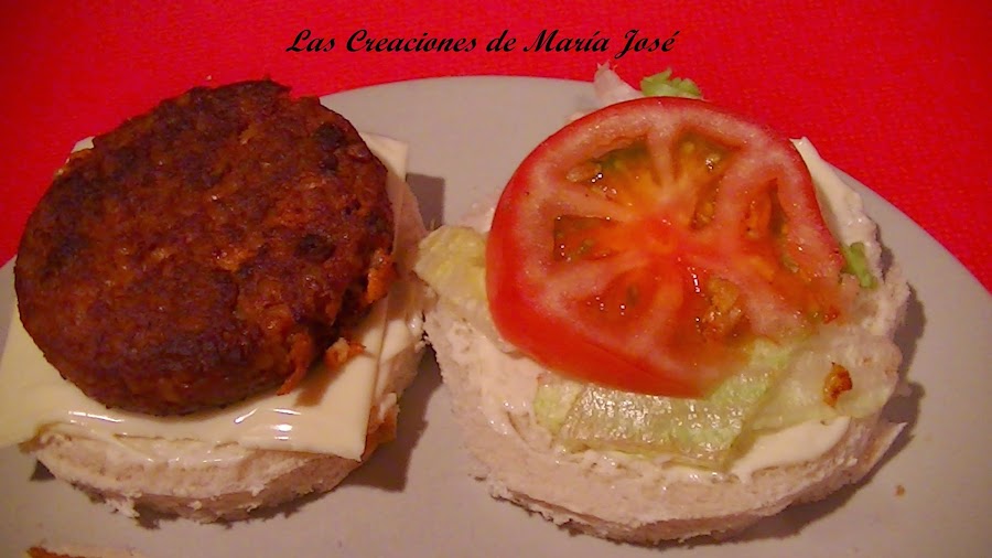 Hacer las hamburguesas; Hamburguesa de tofu a la vasca con un poco de aceite y las de queso y cebolla sin aceite. Recortar el pan de molde un poco mas grandes que las hamburguesas, poner lechuga, 1 rodaja de tomate, la hamburguesa, el queso en lonchas y finalizar con la otra tapa de pan de molde, todo por ese orden con todas las hamburguesas. No las había probado nunca y tengo que decir que me sorprendió lo rico que estaban, os la recomiendo.