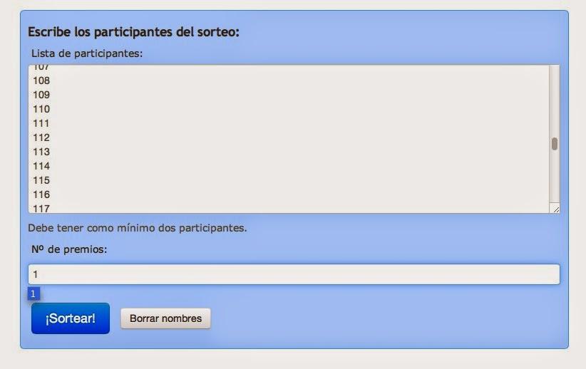 Introduzco los números asignados a cada participante. Hay algunas de vosotras que jugáis con 1 participación y otras muchísimas que jugáis con 2 y hasta con 3!!!, lo que me hace muy feliz porque significa que hay muchas clientes entre las participantes (oléeeee)!!!
