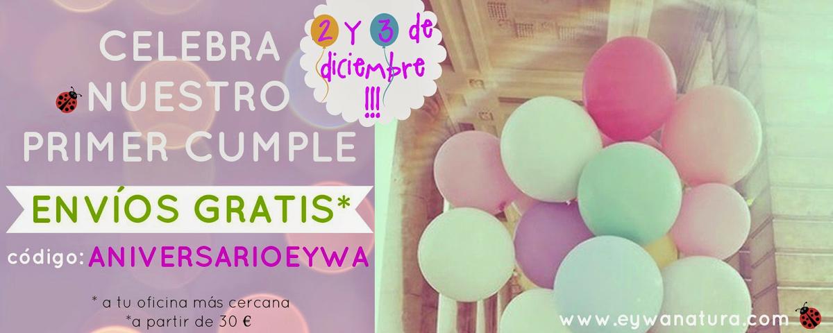 Hoy y mañana, 2 y 3 de diciembre podéis disfrutar de envíos gratis para hacer vuestros pedidos en la web!!! Recordar aplicar el cupón ANIVERSARIOEYWA al validar vuestro pedido y ya está!!! Porque en el Aniversario de Eywanatura, el regalo siempre es para vosotras!!!