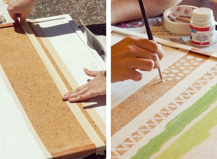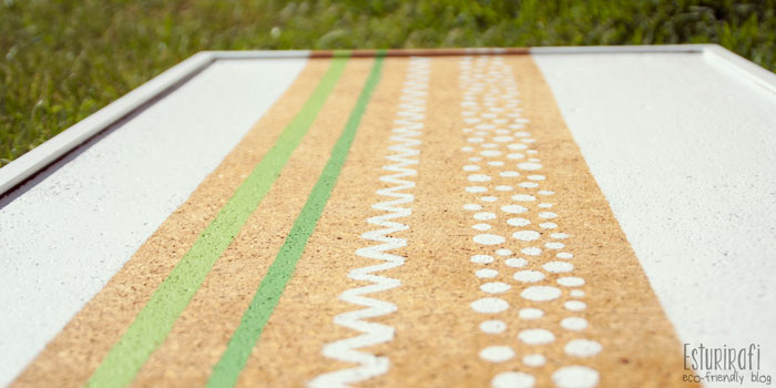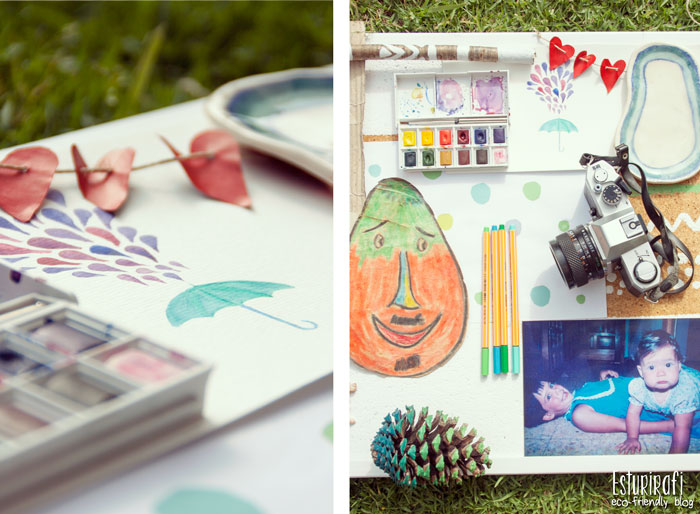 Elegí el verde, porque es mi color favorito y esos tonos son los colores de Esturirafi. El blanco representa el fondo del blog, que me gusta que sea claro y limpio. A continuación, hice unos dibujos inspirados en el DIY "Un marco de fotos muy natural" que hice con unas ramas. Et voilà! ¡Tablero listo! :-)