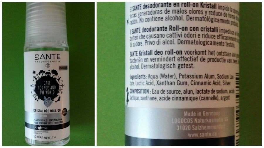 No contiene alcohol pero si potassium alum. Aroma súper agradable y sutil. Práctico formato en roll-on de 75 ml. Se absorbe rápido y deja la axila seca. No lleva sello de certificación bio pero la marca asegura su control en contenido de níquel, que no contiene parabenos ni clorhidrato de aluminio.