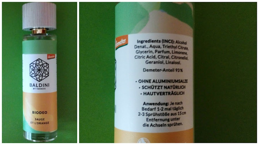 Se presenta en un frasco elegante (casi de perfume) de cristal y formato spray, es muy cómodo también de utilizar. Aplico unas 5-6 pulveraciones en cada axila. Se absorbe muy rápido. De aroma intenso a cítrico eso si, pero muy agradable. 70 ml. Certificado por Natrue y Demeter. Precio aprox. de 10,40 €.