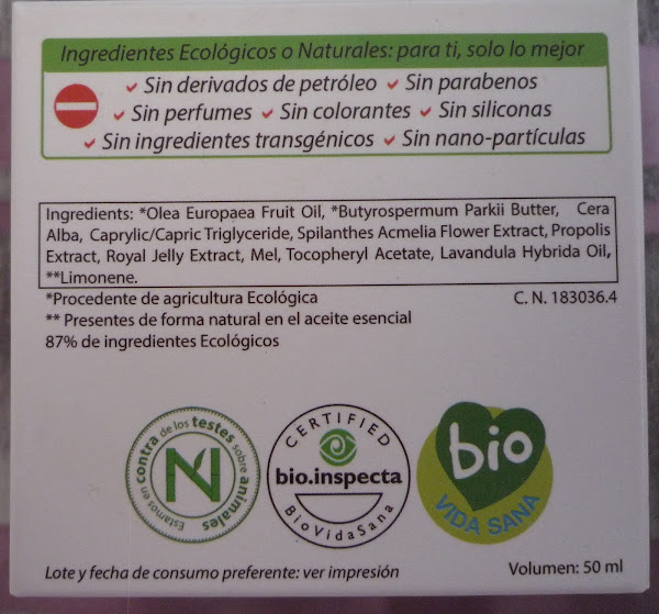 ¿Os habéis fijado en este INCI? Llama la atención, o mejor dicho, impacta ver ocho principios activos todos juntos: aceite de oliva virgen extra, manteca de karité, cera de abejas, extracto de Acmella, extracto de propóleo, extracto de jalea real, miel y lavandín (Lavandula hybrida oil no es exactamente lavanda, sino que es un híbrido de ésta), el aceite de oliva en el primer lugar y nada de agua como ingrediente base. Es una maravilla, ¿no os parece?