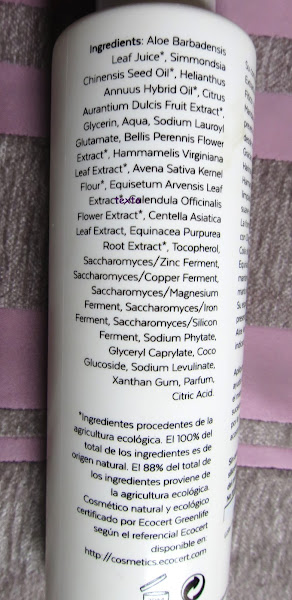 Lleva gran cantidad de componentes maravillosos con diversas propiedades, como por ejemplo los que ayudan a limpiar y a tonificar la piel: el aceite de jojoba (uno de los mayoritarios) que además de no ser comedogénico, es muy hidratante y puede usarse en todo tipo de pieles (incluyendo las grasas y mixtas), la avena que ayuda a absorber la suciedad y los residuos celulares, respetando y cuidando la estructura cutánea (además con efecto calmante y antiinflamatorio) y el agua de hamamelis, un excelente tónico astringente que cierra los poros y ayuda a tonificar. También los que aportan efecto antiedad ayudándonos en nuestra lucha diaria contra las arrugas, como la centella asiática (excelente renovador de tejidos) y la cola de caballo que contiene silicio y los minerales necesarios para sintetizar el colágeno y la elastina.