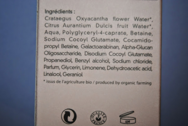 INCI: Crataegus Oxyacantha flower water*, Citrus Aurantium Dulcis fruit water*, Aqua, Polyglyceryl-4-caprate, Betaine, Sodium Cocoyl Glutamate, Cocamidopropyl Betaine, Galactoarabinan, Alpha-Glucan Oligosaccharide, Disodium Cocoyl Glutamate, Propanediol, Benzyl alcohol(1), Sodium chloride, Parfum, Glycerin, Limonene, Dehydroacetic acid(1), Linalool, Geraniol.