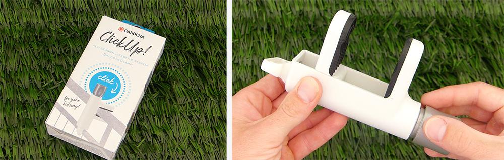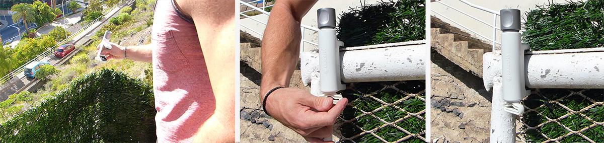 Vamos a sujetar estos accesorios a la valla gracias al soporte para balcón ClickUp! de Gardena. Se trata de un agarre robusto y fuerte, con un tornillo de fijación bastante eficaz.