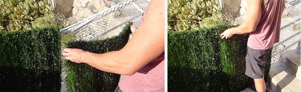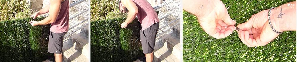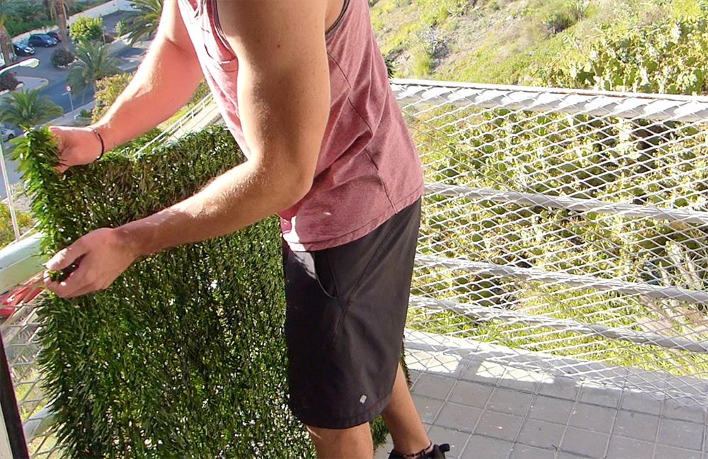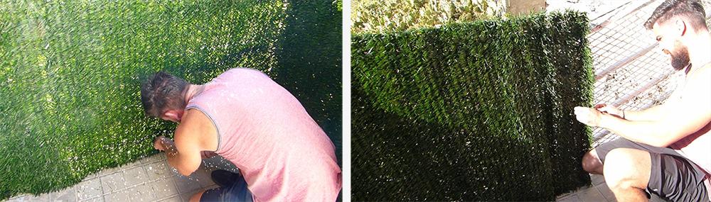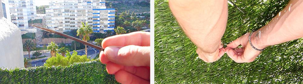 Vamos a amarrar el seto a la valla mediante cintillos o bridas de manera muy sencilla. Atamos una de las varillas metálicas verticales del seto a la malla de la valla.
