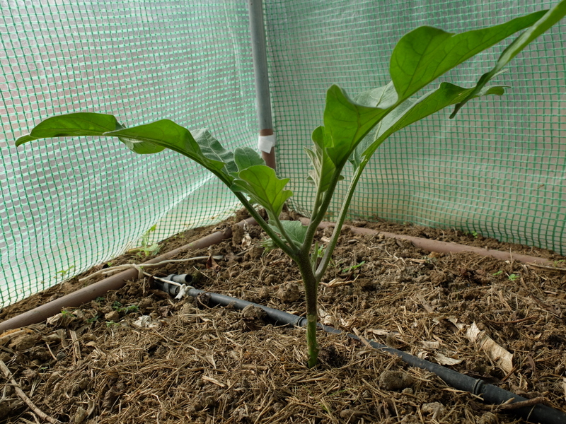 Y por ultimo, comentar que tras los primeros riegos del terreno donde tengo sembradas las patatas de otoño, nacieron varias plantas de berenjena. He cogido una de ella y la he colocado dentro del invernadero, para ver si también puedo obtener unas berenjenas durante el invierno, aunque como se puede observar, su desarrollo vegetativo es menor que el resto de las demás plantas.