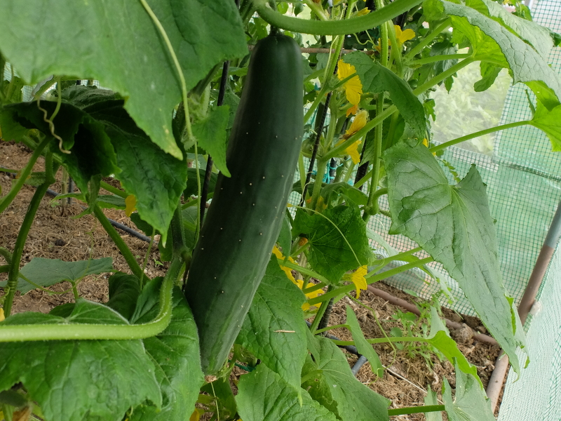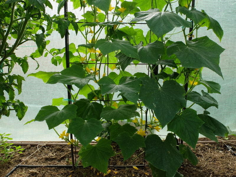 Presenta una muy abundante floración y ya se pueden apreciar como cuelgan pepinos de gran tamaño, aptos para ser recolectado para su consumo.