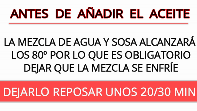 Remover hasta que se disuelva y dejar enfriar COMPLETAMENTE ( mínimo necesita 20/30 min) Ésta lejía cáustica que acabamos de elaborar, puede alcanzar una temperatura de hasta 80º