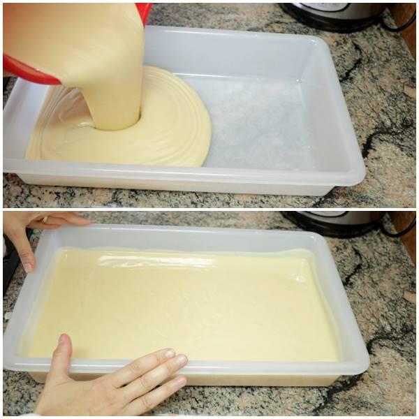Una vez alcanzada la traza del aceite, volcaremos sobre un molde plástico donde iniciará su proceso de saponificación.