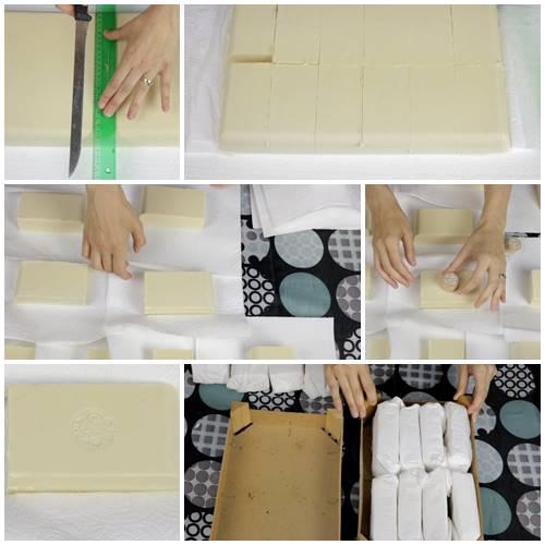 La textura del jabón tras 2/3 días será como la de un bloque de mantequilla recién sacado de la nevera. Corta con un cuchillo de hoja lo más fina posible.