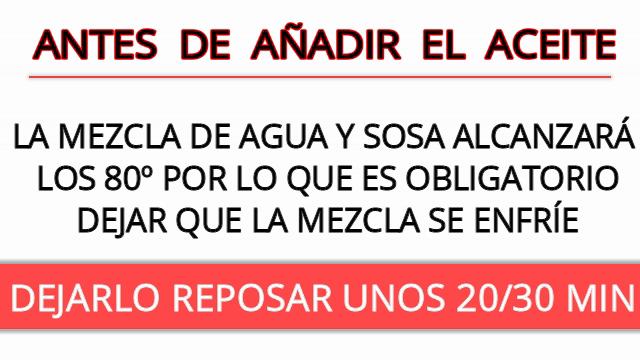 En el cubo de plástico limpio, añadiremos los 760 gr de agua y a continuación, la sosa poco a poco y removiendo. Éste procedimiento hará que emanen gases tóxicos por lo que no os pongáis encima del mismo. Remover hasta que se disuelva y dejar enfriar ya que ésta lejía cáustica que acabamos de elaborar, alcanza una temperatura de hasta 80º