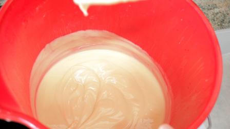 Una vez la temperatura ha bajado, podemos empezar a añadir el aceite poco a poco, removiendo con el palo y siempre hacia el mismo sentido . Una vez añadido todo el aceite, si queremos acelerar el proceso para alcanzar la traza del aceite más rápido, es el momento de hacer uso de una batidora de mano… sino podéis seguir removiendo con el palo (lleva un poco más de tiempo).