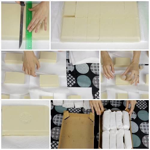 Pasado éste tiempo, es momento de desmoldar y cortar nuestros jabones. Usa guantes porque el jabón aún sigue siendo corrosivo a la piel. La textura del jabón tras 2/3 días será como la de un bloque de mantequilla recién sacado de la nevera. Corta con un cuchillo de hoja lo más fina posible.