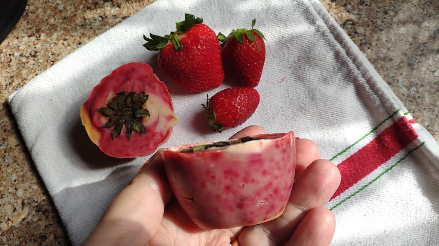 Al final, ni uno ni otro me dejaron el rojo que yo esperaba, ya vimos que el tomate dejó un tono naranja suave muy mono pero no rojo, y los fresones, a pesar de estar maduritos, tampoco, ni color naranja siquiera, así que tuve que echar un poquito de colorante rojo usando mica.