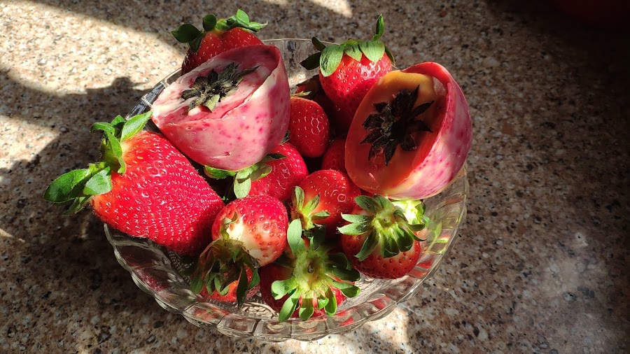 En mi frigorífico tenía unos fresones maduritos preciosos y hermosos, y como hacía tiempo (años) que quería probar con el tomate, me lancé y usé ambos ingredientes para asegurarme un color rojizo. Era el momento ideal para el experimento.