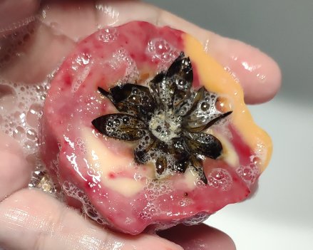 Las semillitas de las fresas las vi interesantes como exfoliantes. Y la verdad es que aún no he usado suficientes veces uno de los jabones para notarlas pero supongo que ahí están y exfoliaran un poquito.