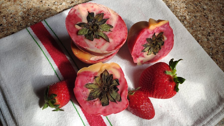 La formulación es mi formulación básica: aceite de oliva, aceite de coco y cera de abeja; fresas y tomate triturado natural, un poquito de mica roja para la parte roja con las fresas (foto) y fragancia a fresas.