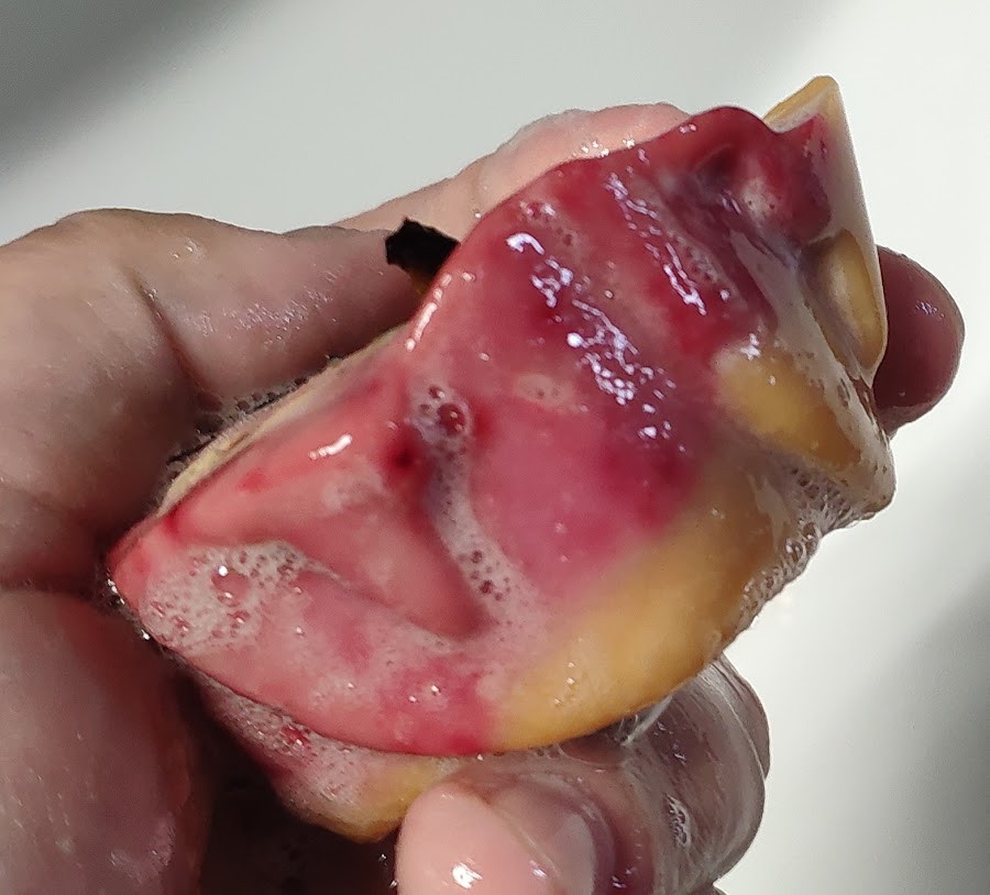 Podéis ver dos colores en los jabones: la parte más roja corresponde a la masa con fresas y mica roja que eché al ver que la mezcla quedaba sin enrojecer; y la parte naranja, es la resultante de mezclar con el tomate, sin colorante de ningún tipo.