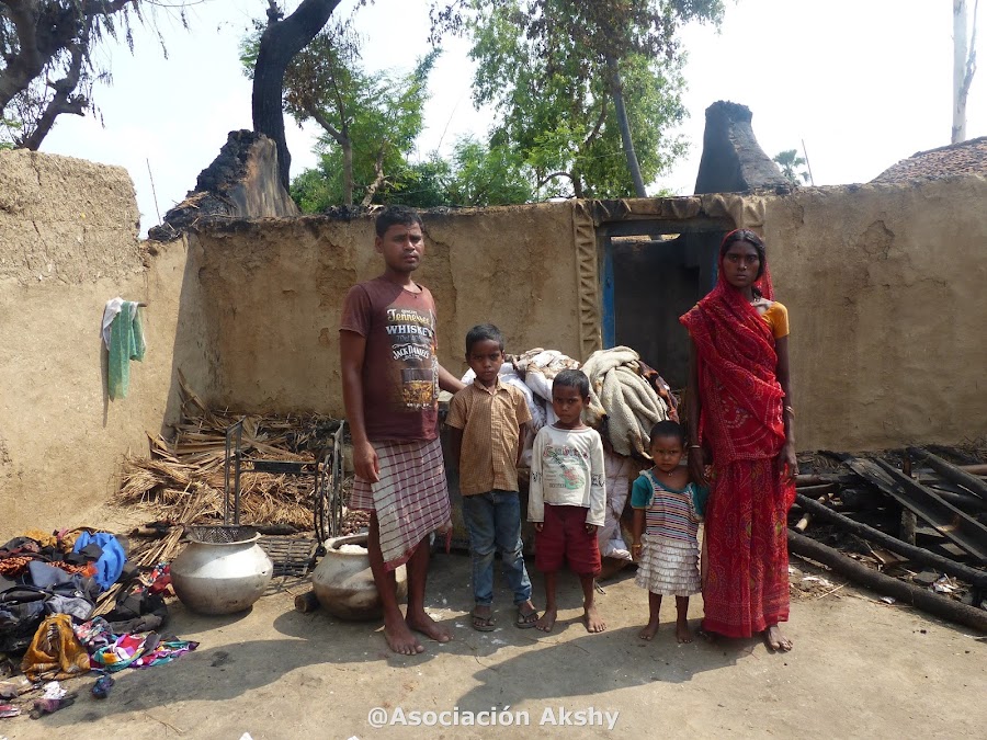 Dos días después totalmente angustiada fui a ver a Raquel sister al Centro Educativo Akshay y le conté lo que nos había pasado. Ella vino a ver mi casa, luego nos llamó y nos dieron dinero para lo más urgente, ropa y comida. Ella se marchaba en dos días a su país y me dijo que intentaría recaudar dinero para ayudaros a reconstruir nuestra casa. Mi marido trabaja como cocinero en otro estado, pero es solo un trabajo temporal. Yo trabajo en el campo como jornalera. Con lo que ganamos nunca podríamos ahorrar lo suficiente para poder reconstruir nuestra casa y tendríamos que acudir a un prestamista que nos pediría unos intereses tan altos que estaríamos endeudados de por vida. Por ello la ayuda que estamos recibiendo de la ONG es muy importante. Mi marido ahora se ha dado cuenta de que la ONG nos está ayudando debido a mi buena relación con ellos, a que he demostrado que soy muy trabajadora y que me preocupo mucho por mejorar y cuido bien de mi familia. Ahora me respeta y me valora. Sin la ayuda de la ONG estaríamos desesperados porque pronto vendrán los monzones y no tendremos un techo.