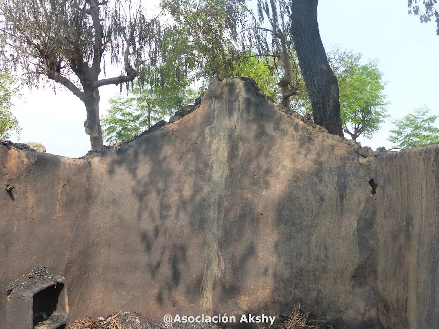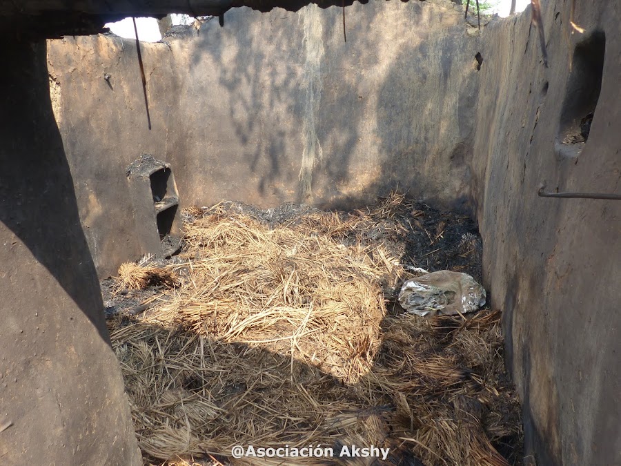 El 9 de mayo mi casa se incendió. Toda mi casa incluido todo lo que tenía dentro ardió, incluso todo el arroz y trigo que teníamos acumulado del trabajo de todo el año. Ese día yo había cocinando dentro de casa y debido al calor toda la familia estábamos durmiendo fuera. De repente por la noche se prendió fuego y como el viento era muy fuerte se propagó rápido. Cuando nos dimos cuenta la gente empezó a echar agua pero solo hay una bomba de agua de donde sale poca agua, no lo suficiente para poder apagar el fuego. Perdimos absolutamente todo, grano, ropa, cama, potes de cocina,?absolutamente todos nuestros pocos bienes de toda nuestra vida, solo quedaron cenizas?