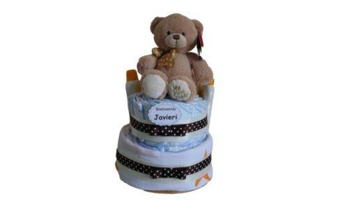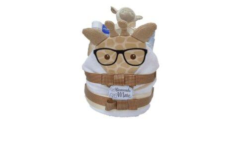 Nuestra Graciosa y práctica tarta de pañales con una capita de tejido polar con forma de jirafa que puede servir como arrullo o mantita.Puedes añadir los productos que desees a la cesta (en Crea tu propia Canastilla) y nosotros los integraremos dentro de la tarta.