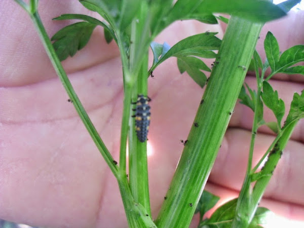 A la semana, de los huevos nacen una larvas de aspecto agusanado de color gris oscuro y unas manchas amarillas. Estas larvas son unas autenticas devoradoras de varios tipos de plagas que causan daño a las plantas de nuestro huerto y sobre todo, de los pulgones.
