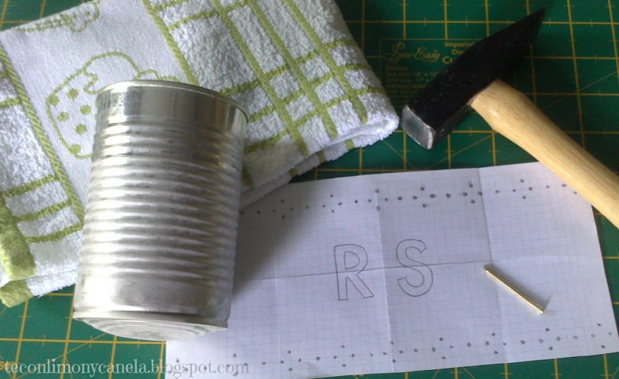 Colocamos la lata sobre el paño bien doblado. Lo mejor es utilizar uno viejo, ya que lo más probable es que con la humedad de la lata, parte del dibujo de la plantilla se pase a la tela.