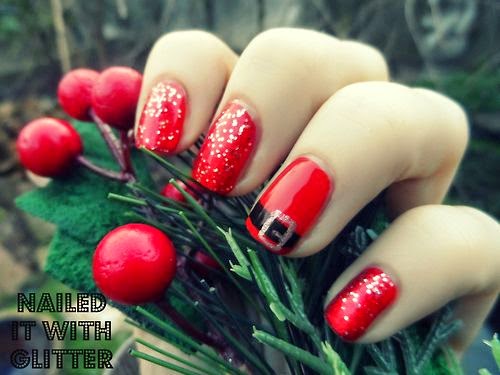 Qué os voy a decir. Esta manicura me parce pre-cio-sa!!! Sencilla y simple pero que no deja a nadie indiferente. En este caso, un rojo muy "Xmas" como el "Rouge Flore" (me recuerda a la Flor de pascua!!!) de Kure Bazaar, el negro "Khôl", un plateado como el "Platinun" o un dorado como el "Or Pur" y un poco de purpurina para darle ese toque mágico y personal!!!
