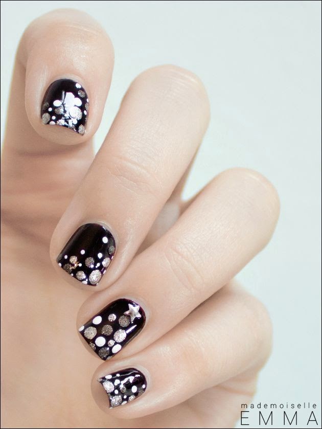 Y entre elegante, festiva y divertida se me ha colado esta en negro, plata y dorados. Con el "Khôl" como base y detalles en blanco, plata y oro: el "Le Blanc", el "Platinum" y un par de dorados como el "Or Bronze" o el "Or Pur" podemos recrear esta preciosa manicura perfecta para las campanadas de Fin de Año!!!