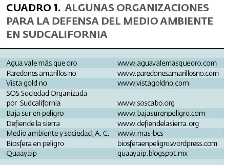En enero 28 de 2011, se llevó a cabo una caravana, desde Los Cabos hasta la ciudad de La Paz, para mostrar el rechazo a la minería tóxica y pedir al Congreso la aprobación de una ley que prohíba el desarrollo de minas tóxicas. Recientemente, se realizó el video Todos juntos por un estado libre de mega minería tóxica, con la participación voluntaria de destacados artistas y profesionales locales; además, se han conformado varias asociaciones civiles contra la minería en BCS (cuadro 1).