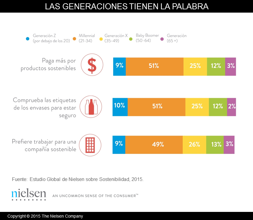 El 51% de los Millenials por ejemplo señala que pagaría más por un producto o marca demuestra ser sostenible. Un 51% de los de esta generación, también afirma que está pendiente de la información de etiquetado de los envases para comprobar si estos son o no sostenibles.