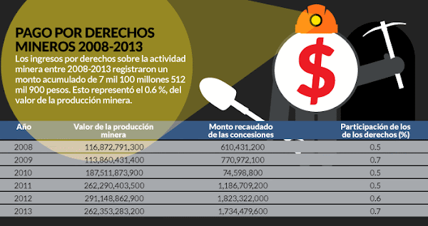 En México investigadores del Centro de Análisis e Investigación Fundar y la Auditoría Superior de la Federación (ASF) han alertado que los concesionarios mineros no están obligados a esclarecer el volumen de su producción. SinEmbargo ha elaborado una tabla que nos muestra que el dinero pagado por las mineras en formas de concesiones o impuestos no llegan a 1%. De los más de 1.2 billones de pesos que recaudaron entre 2008 y 2013, las mineras dieron a los mexicanos (gobierno) solo el el 0.6 por ciento.