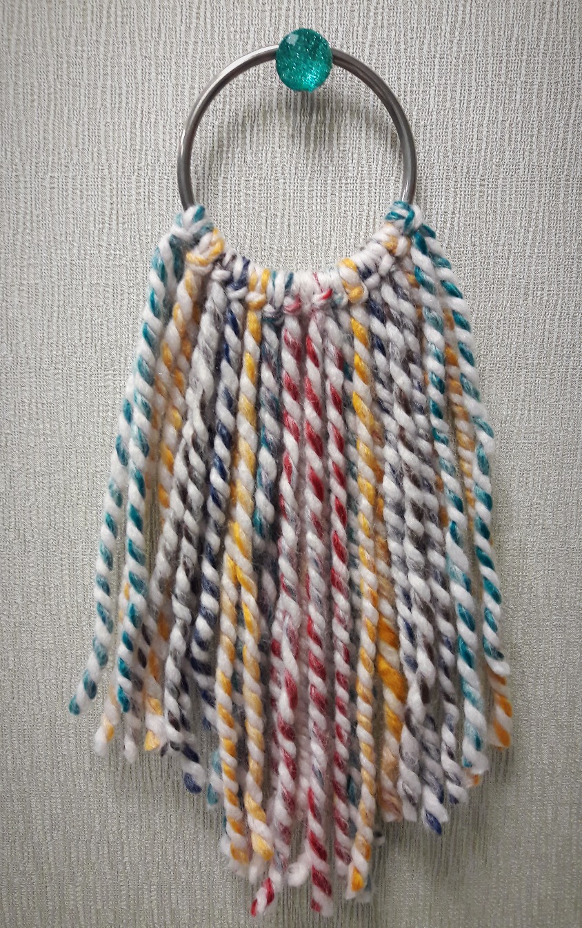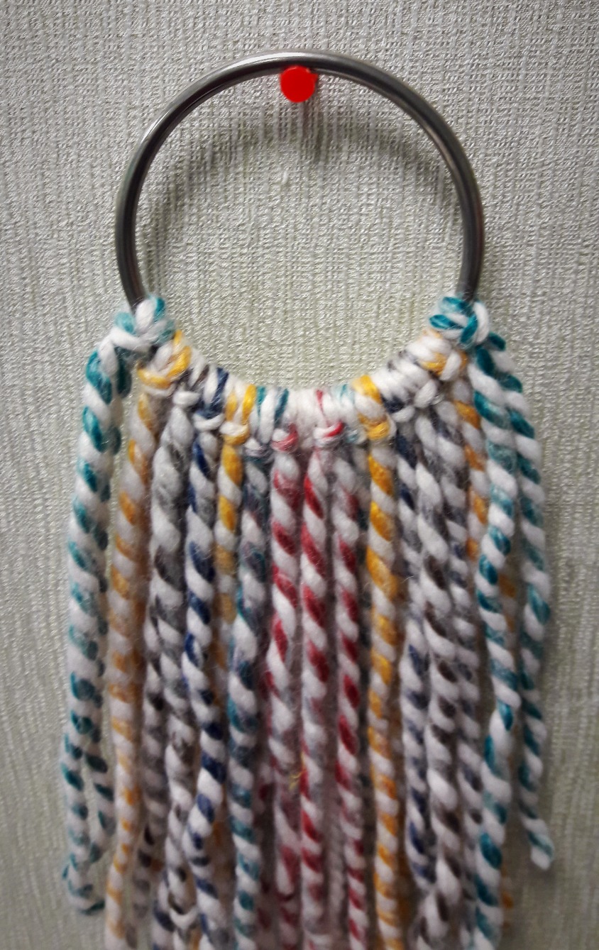 Hilo de lana grueso y súper abultado multicolorDos Aros de MetalTijerasPega Blanca y UHUCuentasTachuelas
