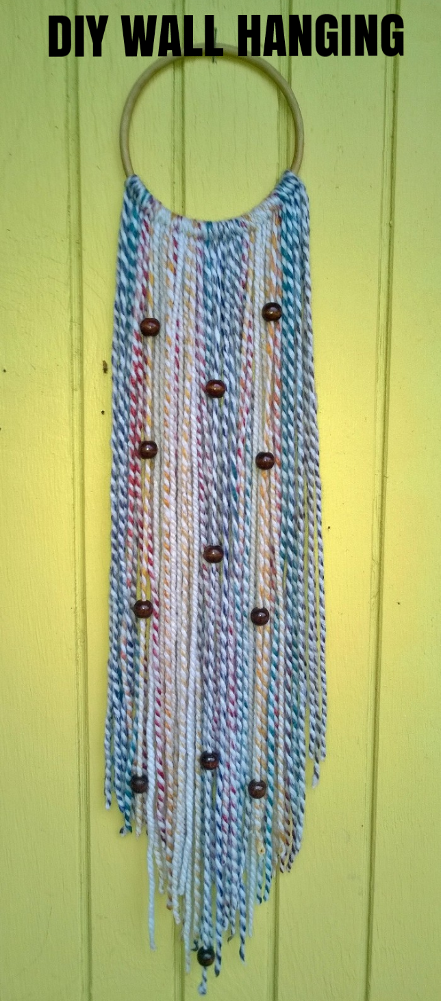 Una vez que haya terminado de atar tus hilos, cuelga el colgante en la pared donde lo vas a mostrar. Entonces corte con una tijera bien afilada la parte inferior en forma de triángulo. Si deseas puedes añadir cuentas en algunas cuerdas al azar para añadir algo de interés. Aplique pega blanca en la última pulgada de cada hilo para evitar que se deshilen.