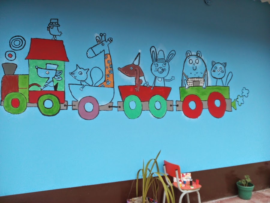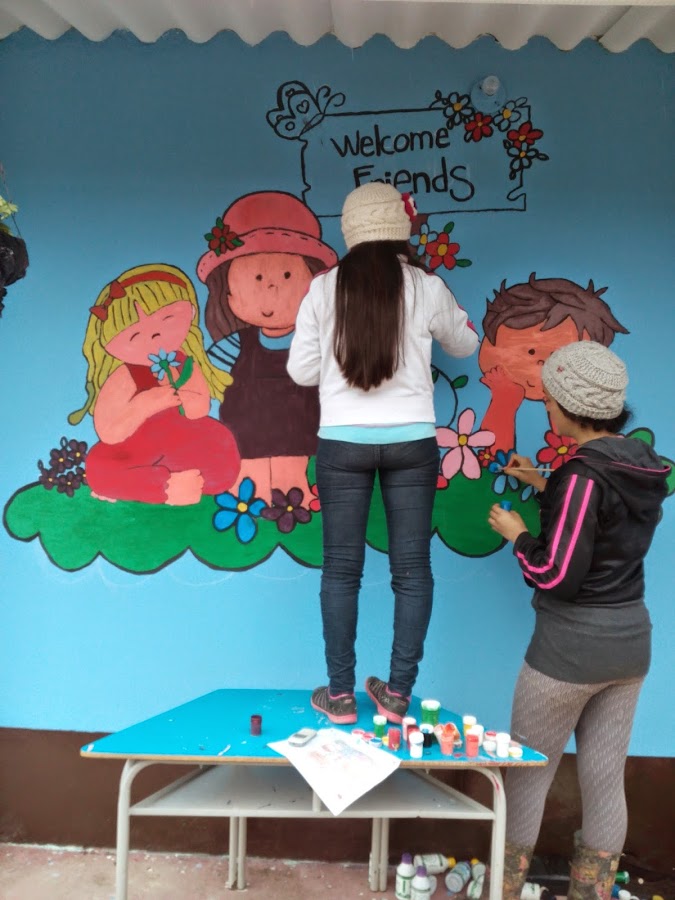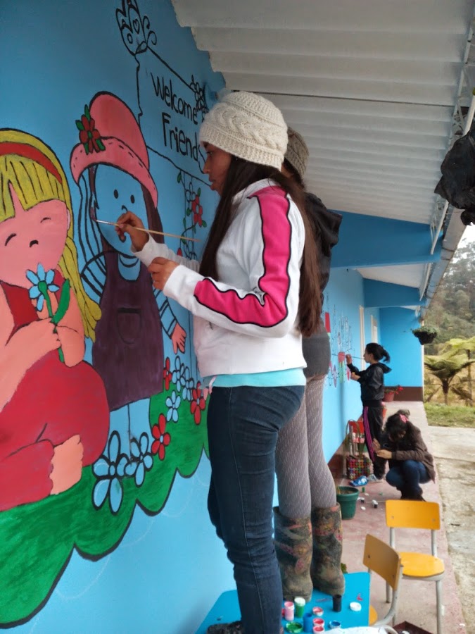 Las niñas de labor social de la E.N.S realizan murales para mejorar el aspecto de la escuela