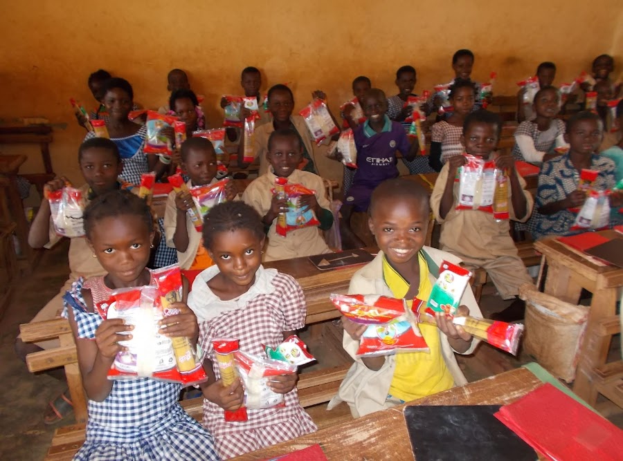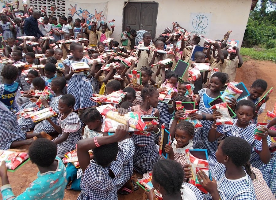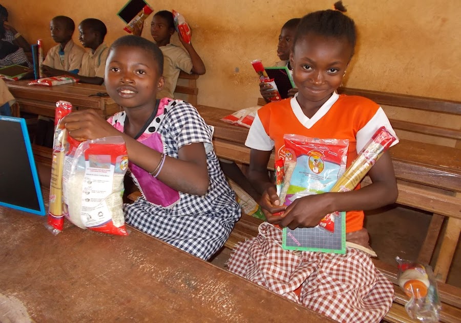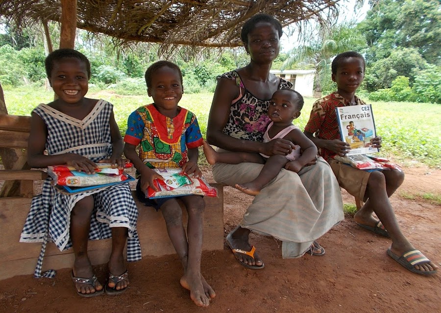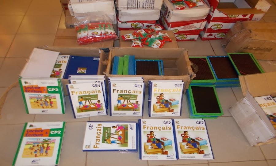 Libros para el CP2 CE1 y CE2, pizarras y tizas para 258 niños. Arroz, tomate y spaghetti para cada niño de la escuela. Para todos y cada uno de ellos.