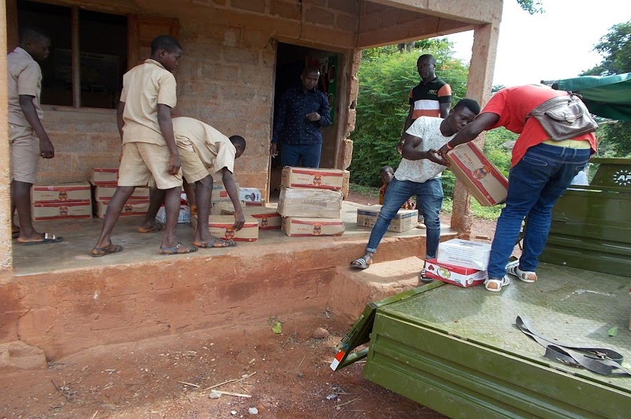 Llegada a la escuela de Bodouakro y descarga. Aquí ayuda todo el mundo.