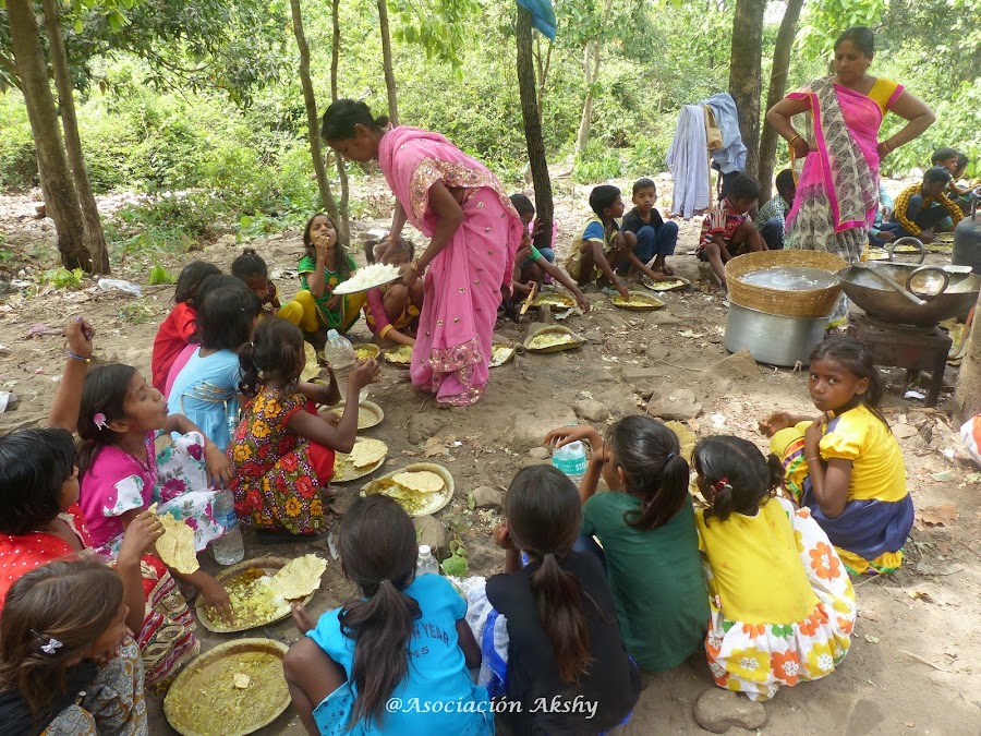 Después del baño vino el momento de la comida para lo cual llevábamos nuestro gas, nuestros potes y ahí cocinamos unas verduras con lentejas, arroz y papad. El agua abre el apetito así que los niños estaban hambrientos.