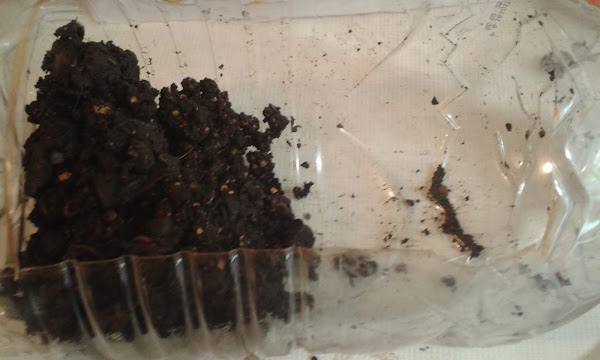 3.- Colocamos el alimento en el lado que quedó libre, cerramos la tapa ( no va a ajustar perfecto, eso no importa) y ponemos el botellón (de ahora en adelante lo llamaremos lombricompostador) dentro de una bolsa de color oscuro en un lugar fresco y húmedo.