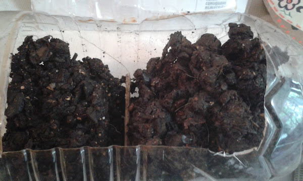 8.- El día 7 si hemos movido el material todos los dias, ya está listo el procompost. Ahora solo tenemos que ponerlo en el lombricompostador al lado de las lombrices y el sustrato (Núcleo iniciador). Y ya tenemos alimento para las lombrices que puede durarle aproximadamete dos meses. Si como le leen, dos meses. En esta foto 4, se ve a la izquierda el contenido de nuestro Núcleo Iniciador y a la derecha el precompost.