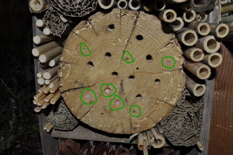Pocos días después comprobamos el éxito con la presencia de los primeros moradores, distintas especies de abejas solitarias.