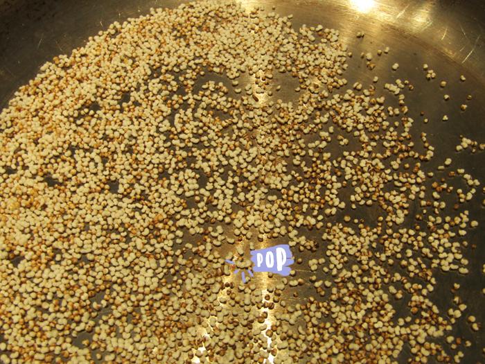 4. Vuelve a colocar la olla al fuego y agrega más o menos una cucharada de amaranto. Va a comenzar a saltar casi en seguida. A penas terminen de saltar, transfiere a otro recipiente y repite este paso de nuevo tantas veces como quieras.