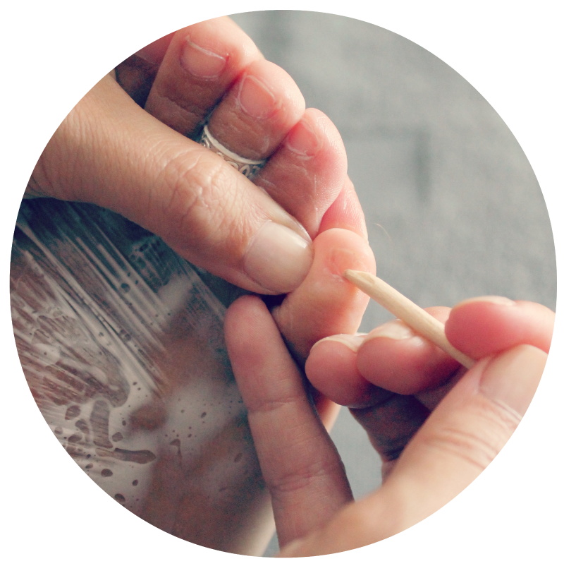 4. Abrimos con cuidado el extremo de los calcetines para dejar libres las uñas y poder trabajar sobre las cutículas con el bastoncito de madera. Ya sabéis, con cariño empujamos las cutículas hacia abajo.