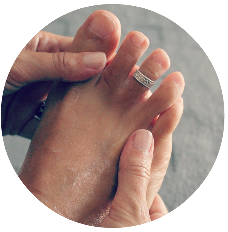 5. Ahora retira los calcetines y masajeamos la crema nutritiva o mascarilla en los pies.